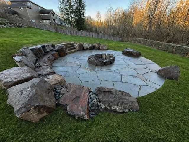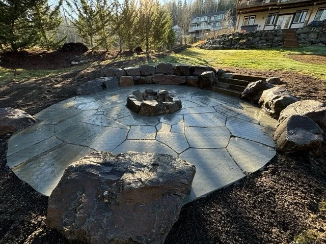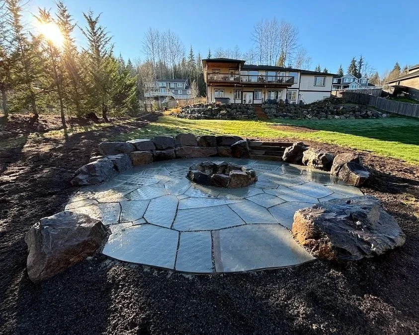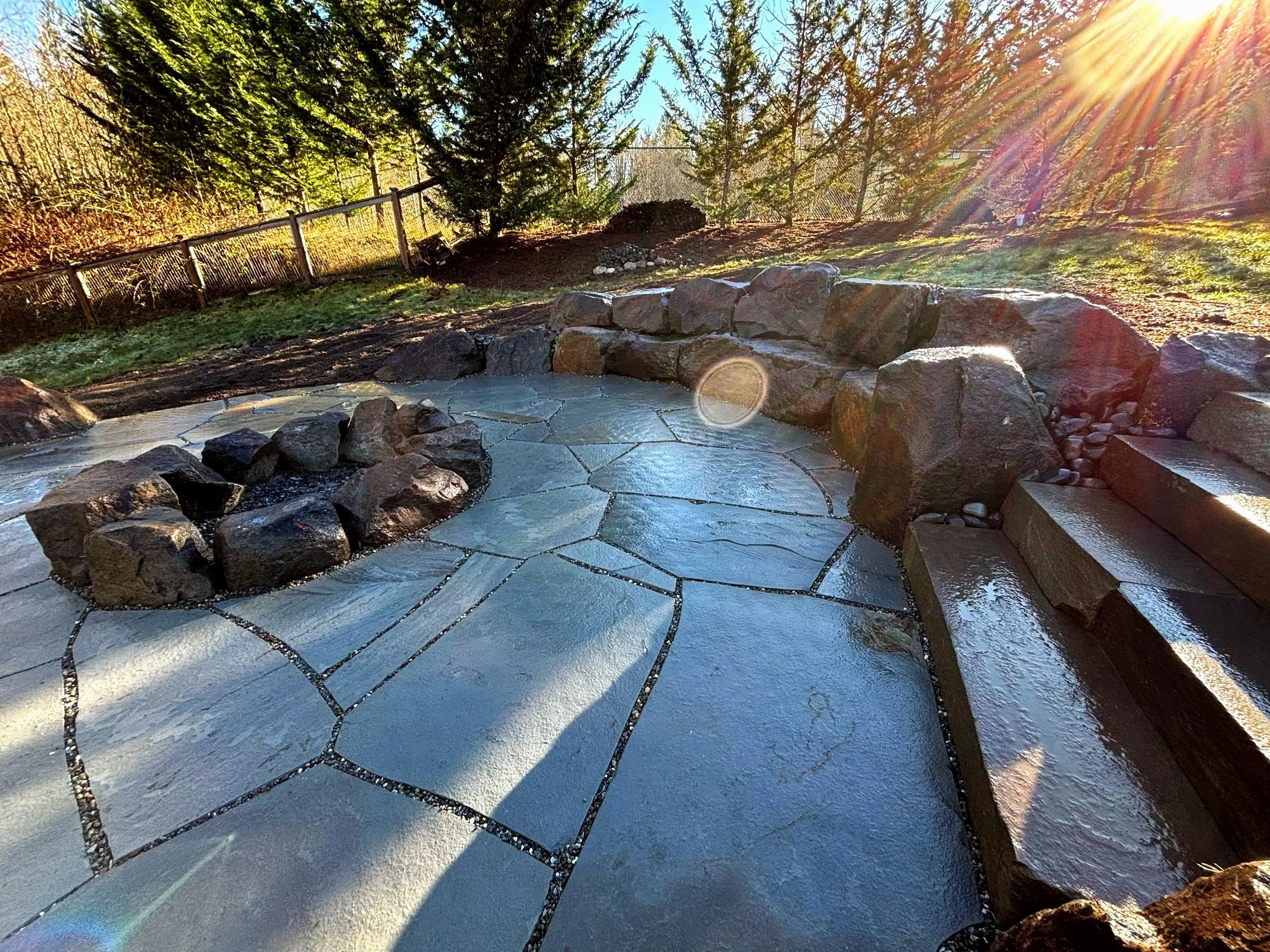 Sunken stone patio with boulder seating walls.